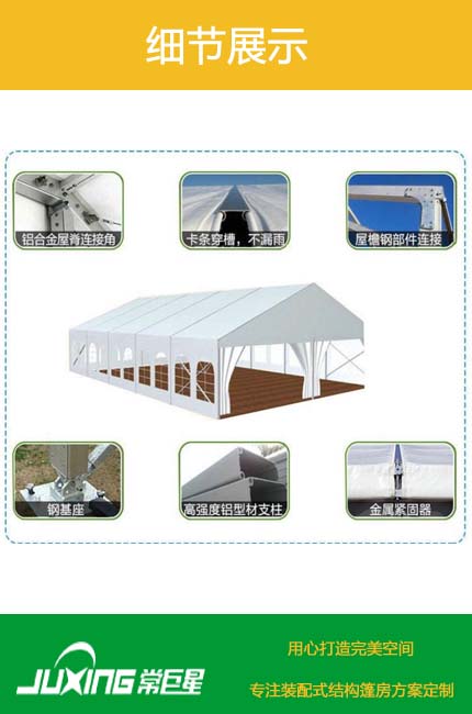 常巨星裝配式篷房公司是一家篷房研發、生產、銷售、租賃于一體的綜合性篷房公司。巨星公司秉著誠信經營、客戶至上的經驗理念服務客戶。本公司產品外觀簡潔大方,內無支柱,百分百利用空間。可選配設施,可加照明,排水,防撞,地臺,空調,發光燈箱,等系統。現有篷房主體框架為中空鋁合金結構,連接部位為采用國家焊接鋼結構,可調節式基座可彌補場地的不平,篷房采用PVC篷布,該篷布具有不拉伸的良好性能,不透光,采用高頻焊接技術,篷房抗風能力達到80-100公里/小時。具有體積小,儲存方便,拆裝靈活快捷易運輸等特點,單位組合式結構,可根據場地的大小自由增加,對搭建場地無特殊要求,一般場地如草地、大理石地、瀝青地面、水泥地均可。篷房內無支柱,場地空間得到利用
